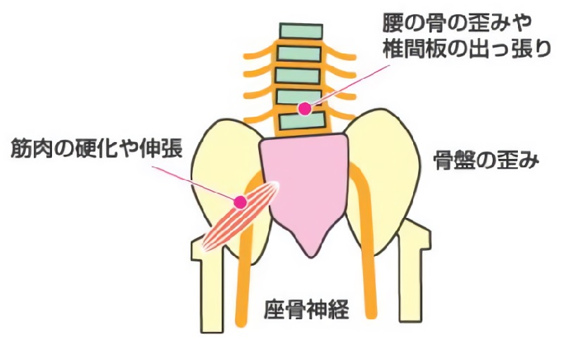 骨盤が傾くことで、神経の通り道が狭くなり、症状が出やすくなります。